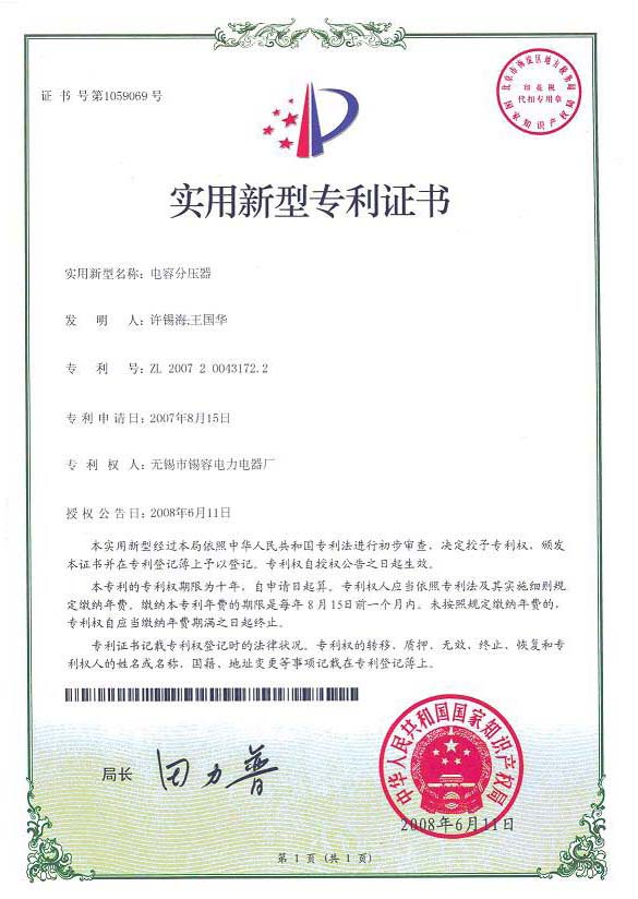 Utility model patent certificate release time:2020-07-20 04:23:27source:Wuxi Xirong Electric Appliance Co., Ltd.Click:1832
