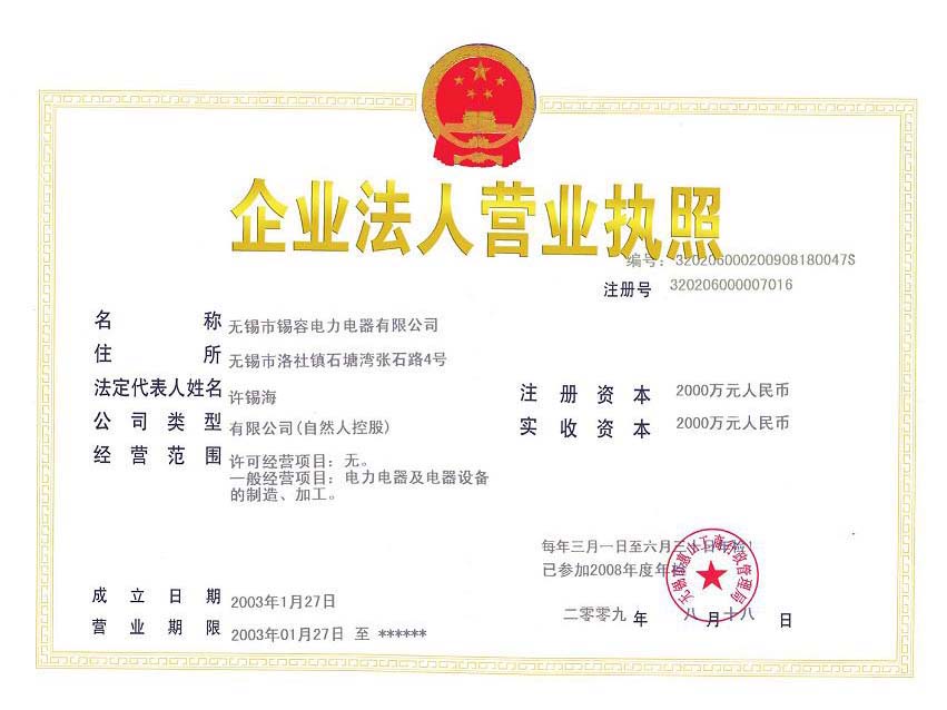 Business license release time:2020-07-20 04:35:57source:Wuxi Xirong Electric Appliance Co., Ltd.Click:1765