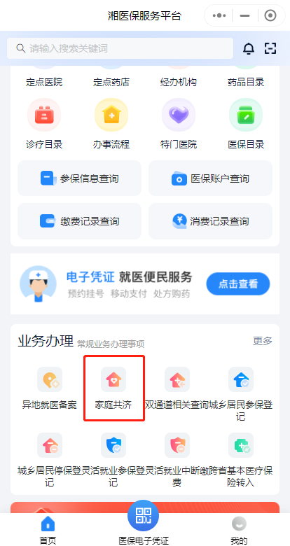 第一步:下載“湘醫(yī)?!盇pp,或進(jìn)入“湘醫(yī)?!盇pp小程序,登錄后在首頁“業(yè)務(wù)辦理”中找到“家庭共濟(jì)”,點(diǎn)擊“共濟(jì)申請”。